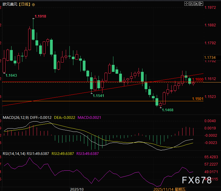 目前压力位为1.1600,支撑位为1.1500。